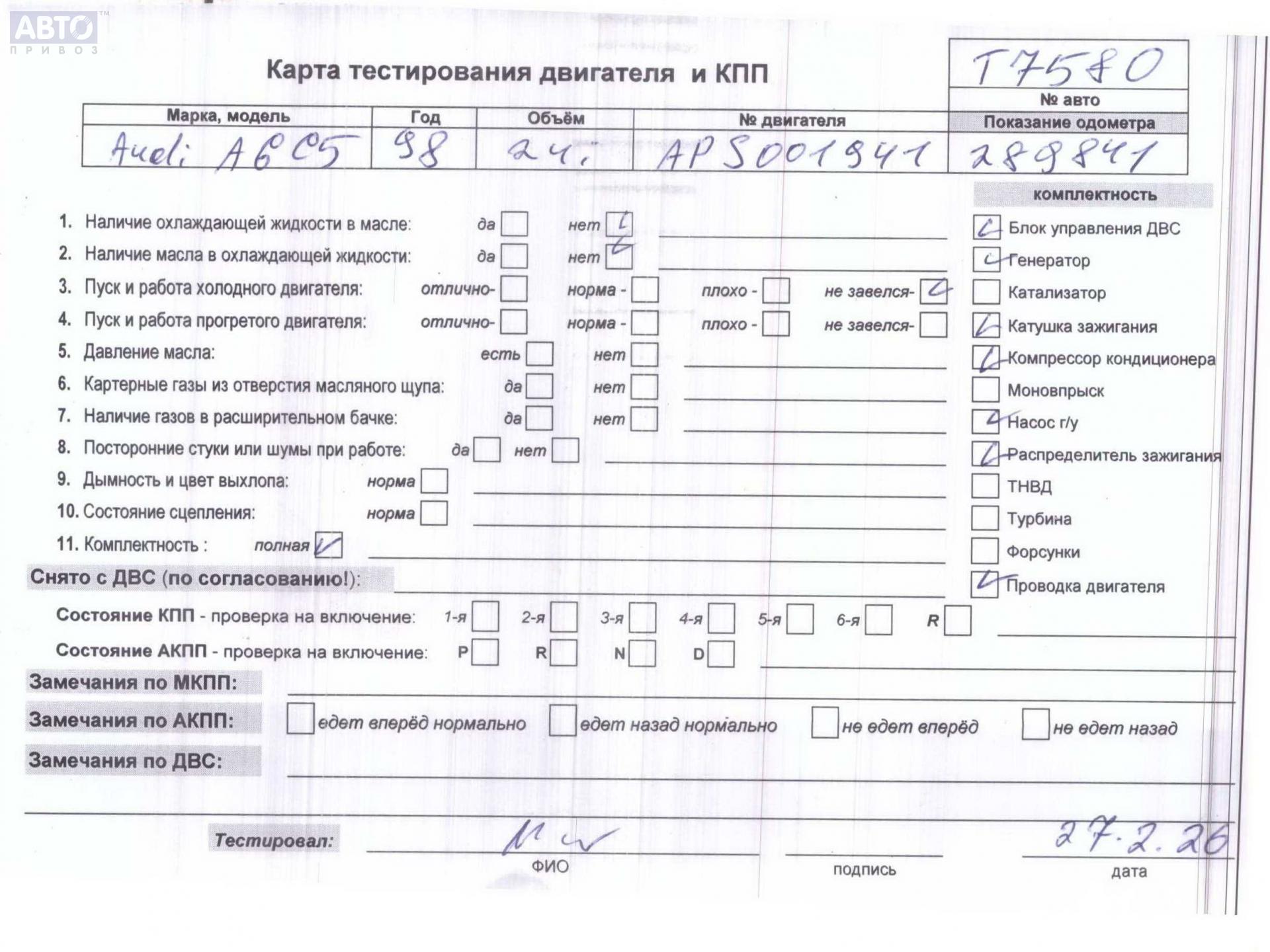 Купить с доставкой б/у APS, Двигатель (ДВС) для Audi A6 C5, 1998, (54941322) с разборки России.
