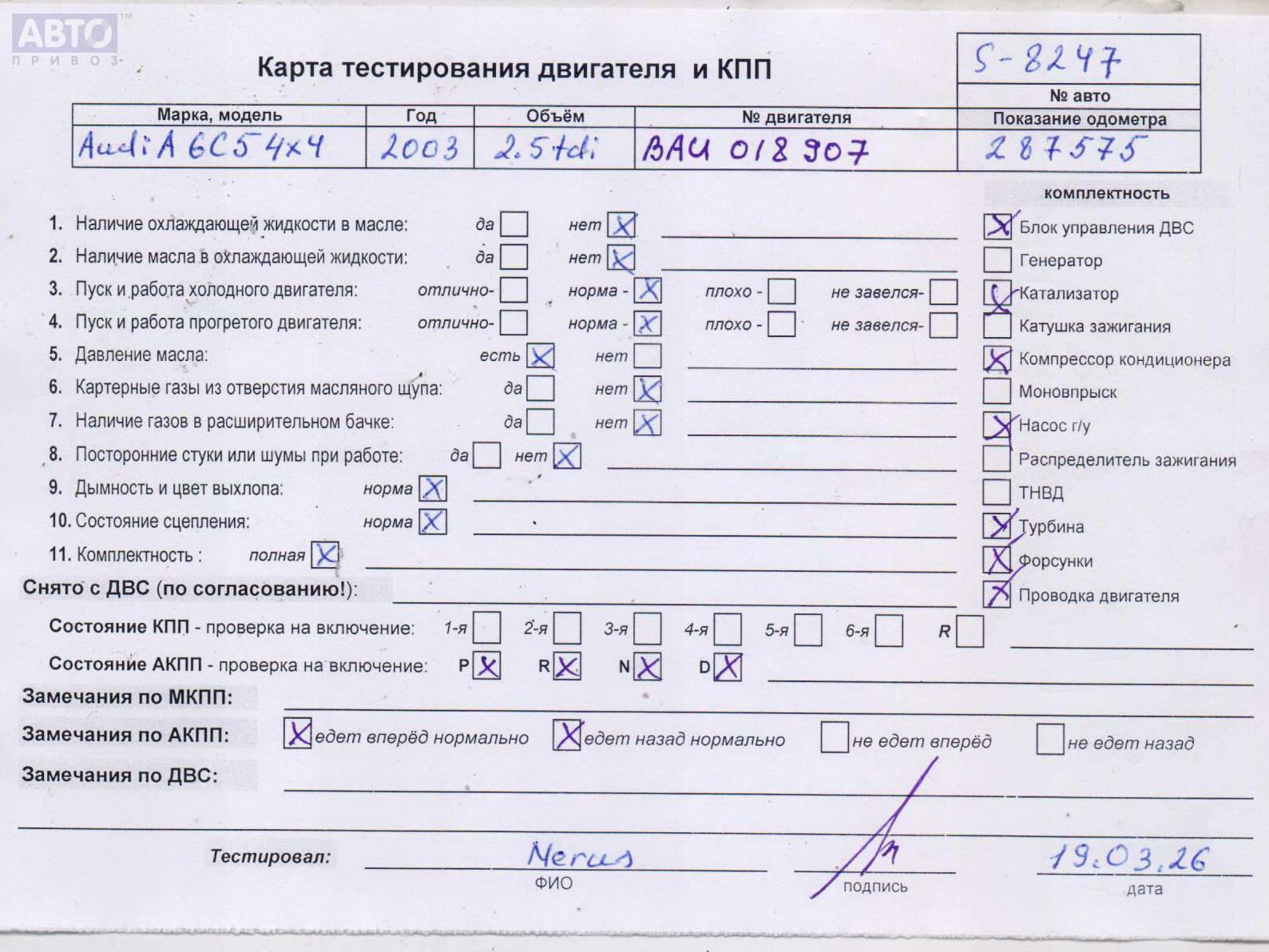 Хотите купить контракнтую запчасть Двигатель (ДВС)? У нас в наличии есть оригинальные автозапчасти бывшие в употреблении, хорошего качества по приемлемым ценам. Практически на все наши запчасти мы даем срок проверки (от 14 до 30 дней) (https://www.autopriwos.ru/return.html). На сайте Вы можете выбрать б/у запчасть по оригинальному номеру, моделе, марке автомобиля и маркировке. Каждая запчасть Двигатель (ДВС) для Audi A6 C5, 2003, купить б/у (55080588) проходит внешний осмотр на выявление неработоспособности для успешного решения проблемы вашего автомобиля.