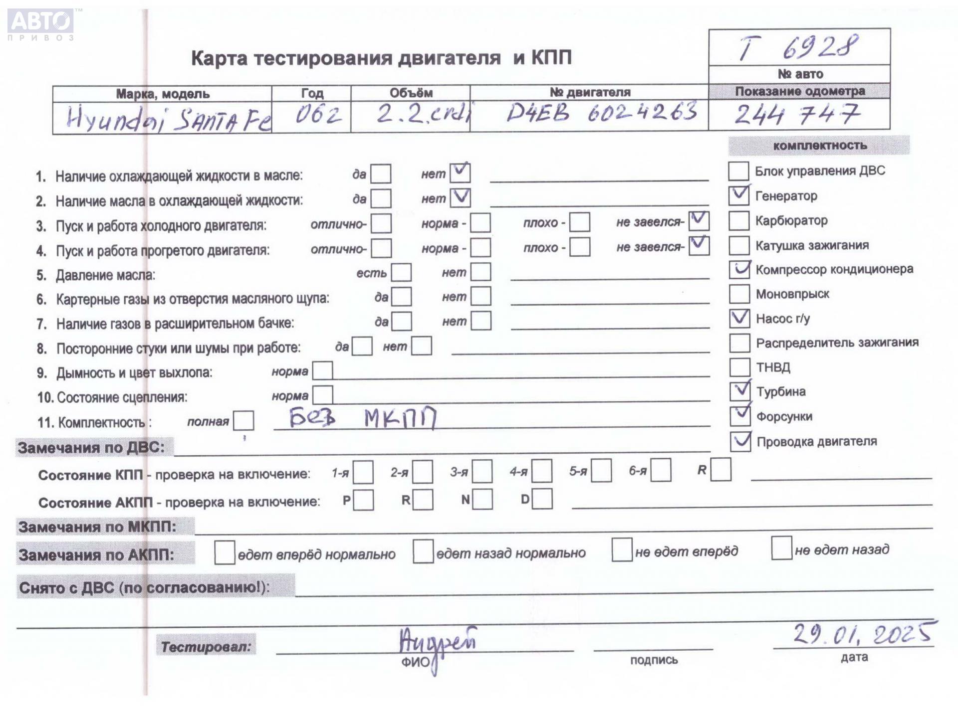Хотите купить контракнтую запчасть Двигатель (ДВС) на разборку? У нас в наличии есть оригинальные автозапчасти бывшие в употреблении, хорошего качества по приемлемым ценам. Практически на все наши запчасти мы даем срок проверки (от 14 до 30 дней) (https://www.autopriwos.ru/return.html). На сайте Вы можете выбрать б/у запчасть по оригинальному номеру, моделе, марке автомобиля и маркировке. Каждая запчасть Двигатель (ДВС) на разборку для Hyundai Santa Fe, 2007, купить б/у (54550218) проходит внешний осмотр на выявление неработоспособности для успешного решения проблемы вашего автомобиля.