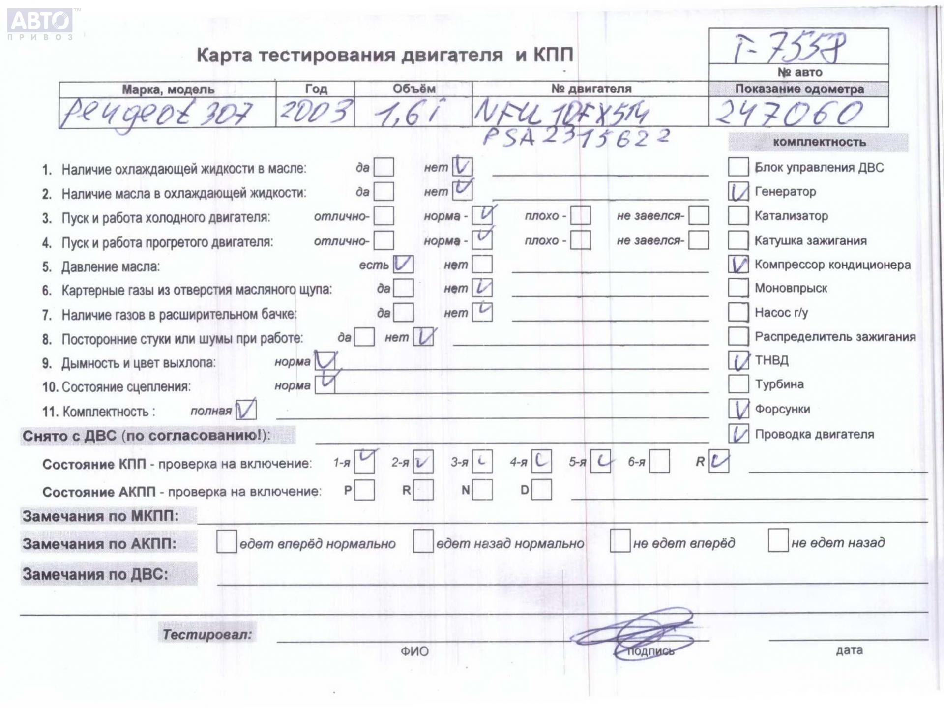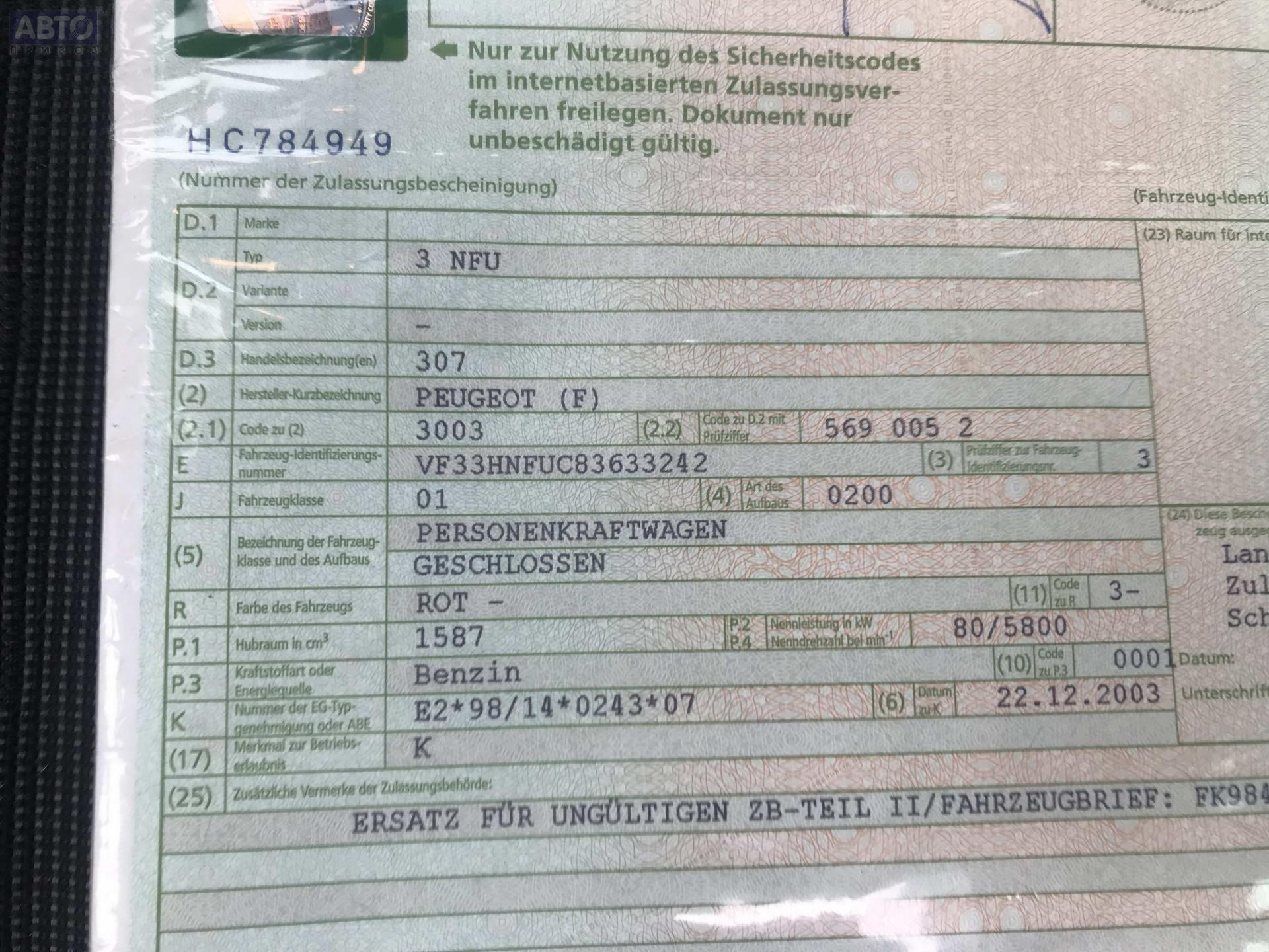 | Марка / Модель / Год: | Peugeot 307 2003 |