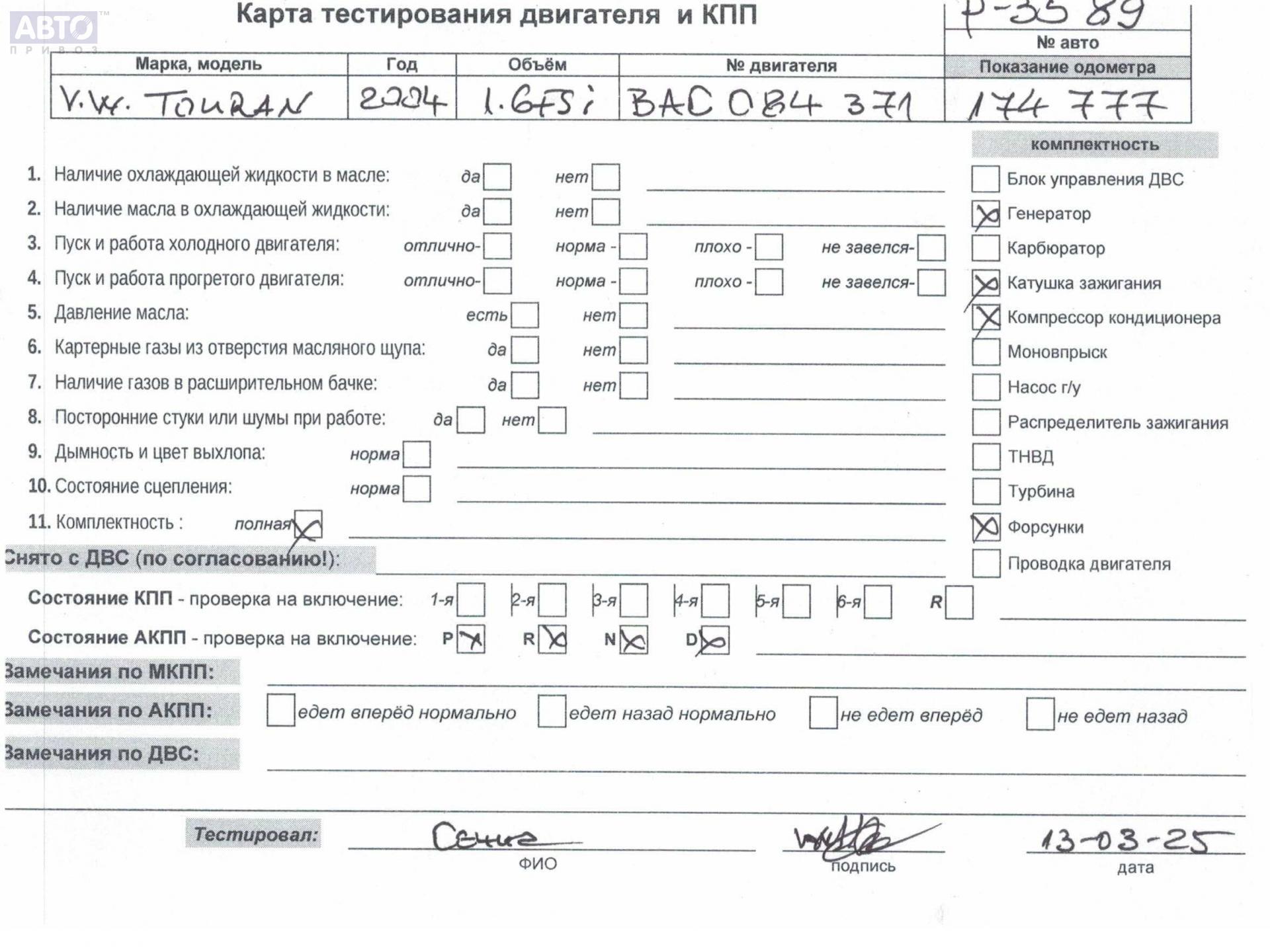 | Марка / Модель / Год: | Volkswagen Touran 2004 |