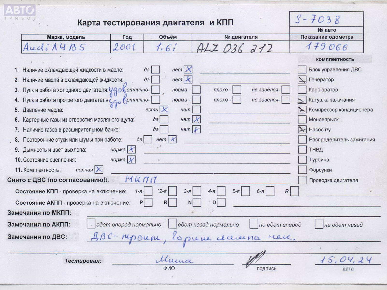 | Автомобиль / VIN: | S7038 WAUZZZ8DZ1A156418 |