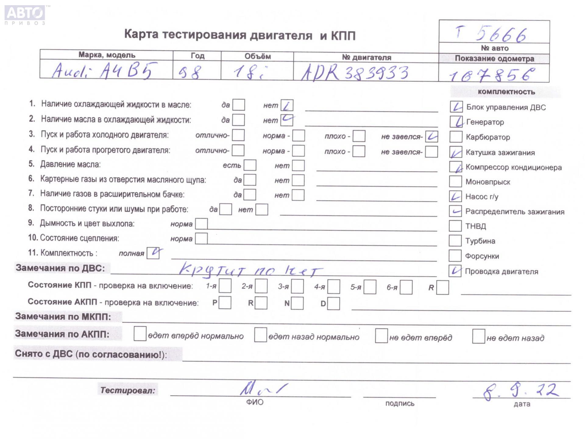 | Марка / Модель / Год: | Audi A4 B5 (1994-2001) 1998 |