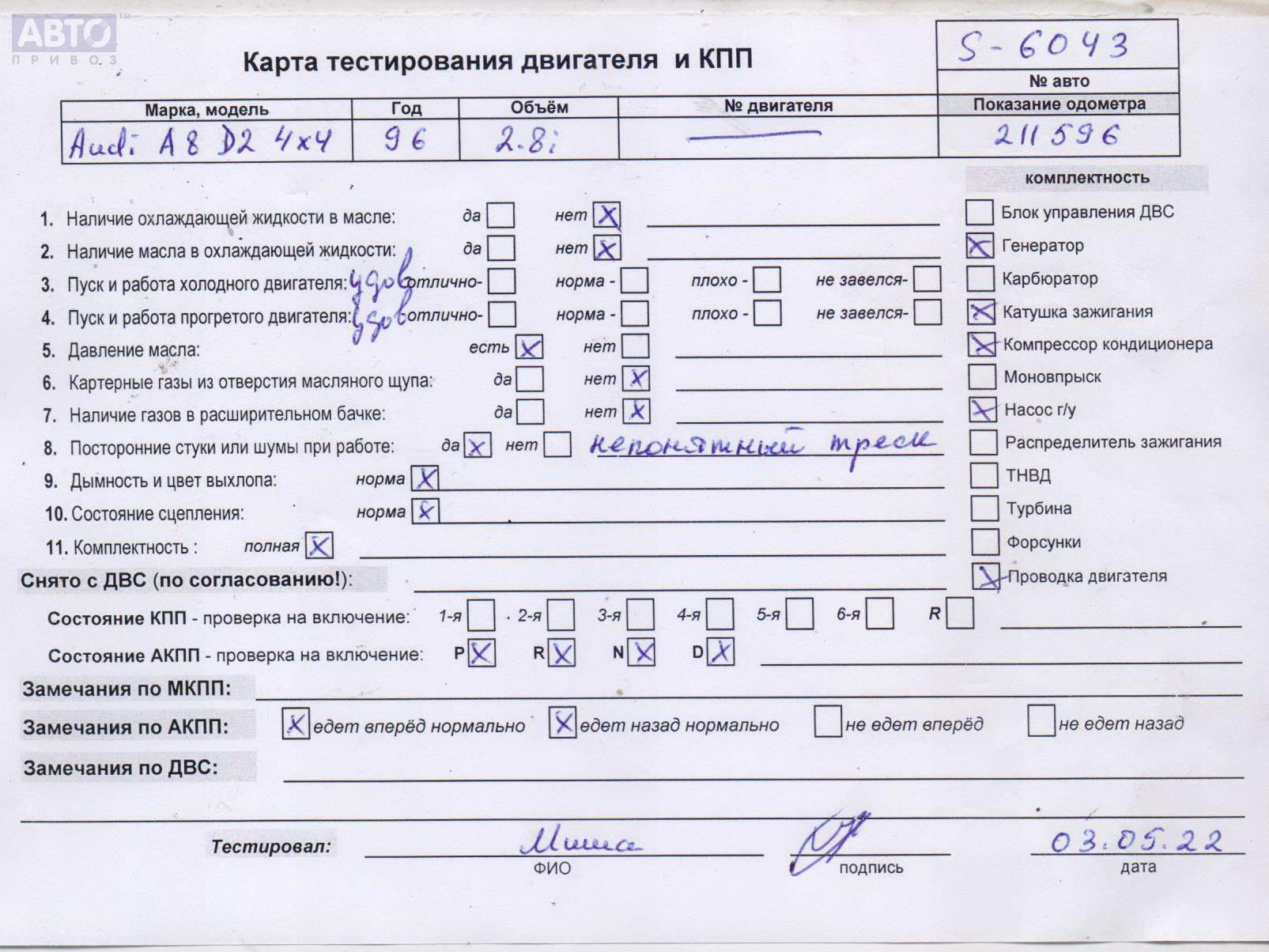 | Марка / Модель / Год: | Audi A8 D2 (1994-2002) 1996 |