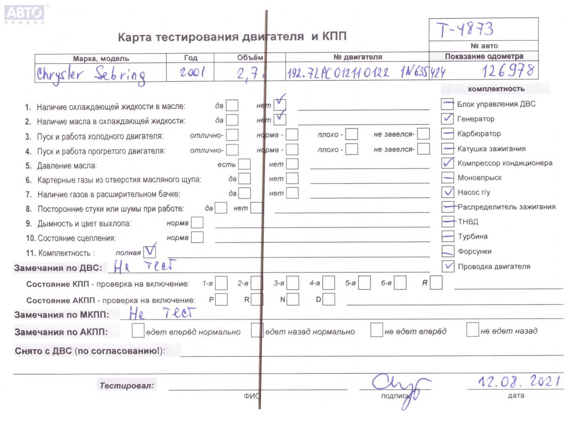 | Марка / Модель / Год: | Chrysler Sebring 2001 |