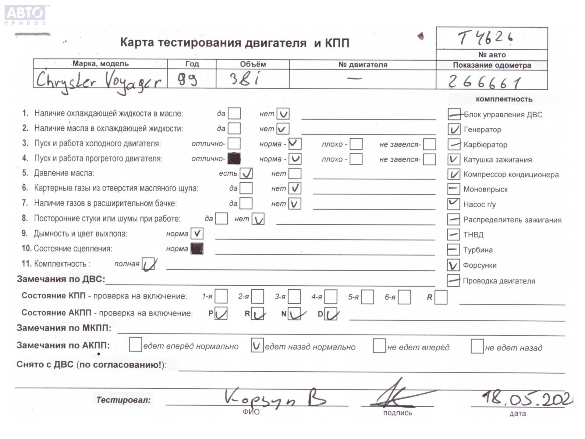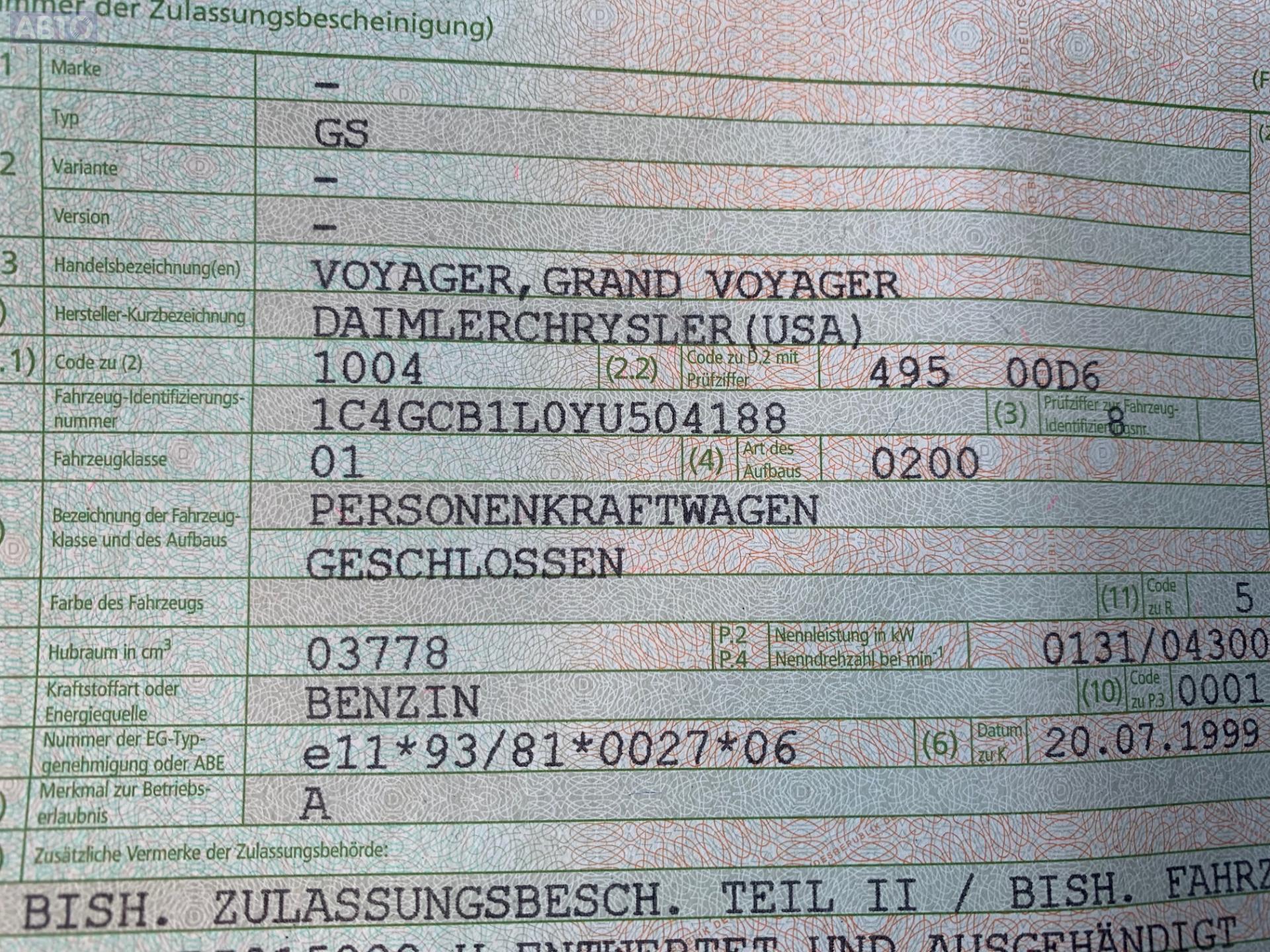 | Марка / Модель / Год: | Chrysler Voyager (1996-2000) 1999 |