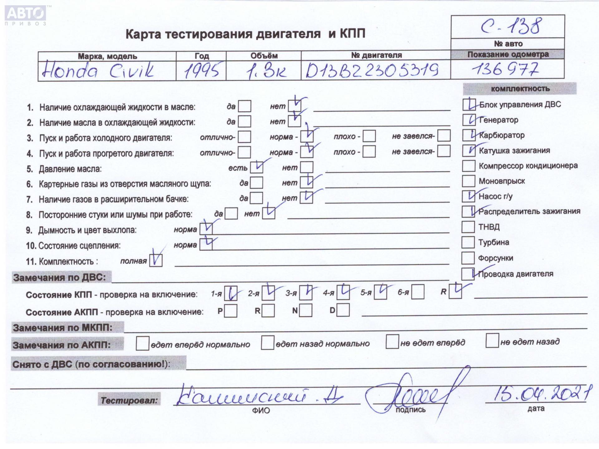 | Марка / Модель / Год: | Honda Civic (1991-1995) 1994 |