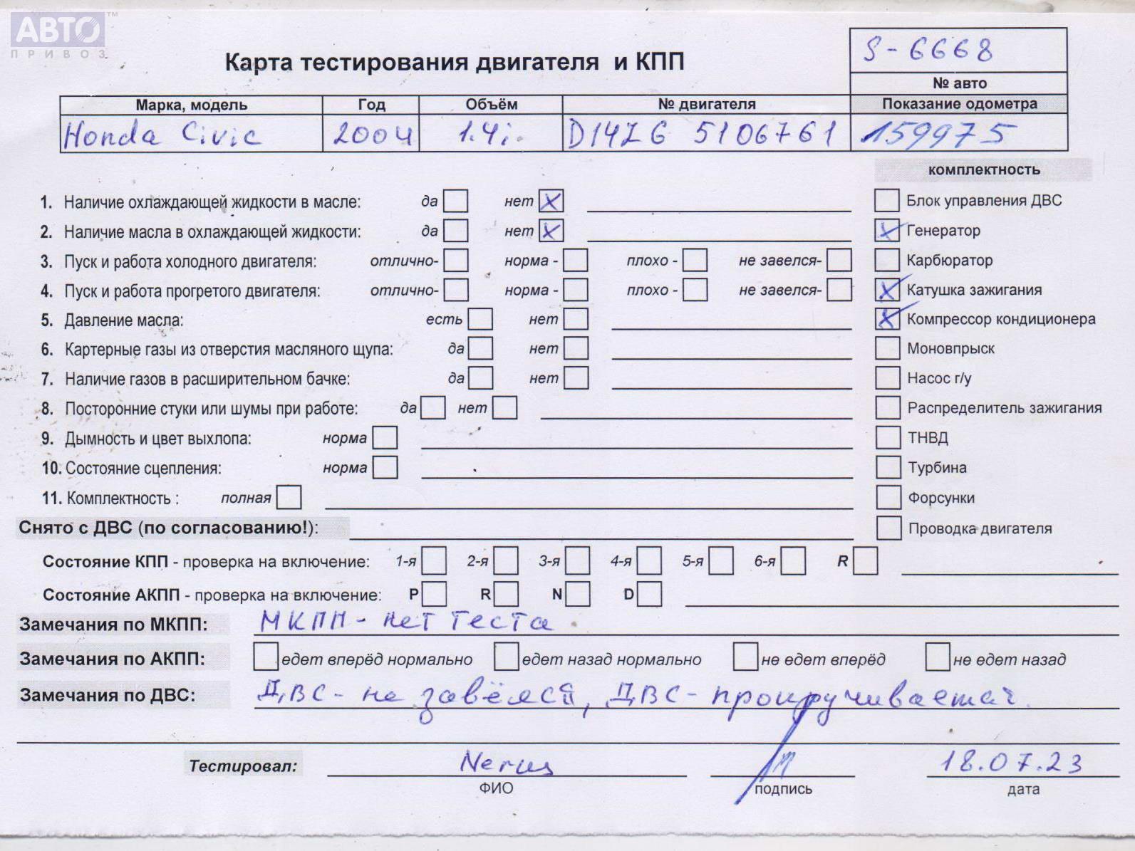 | Марка / Модель / Год: | Honda Civic (2001-2005) 2004 |