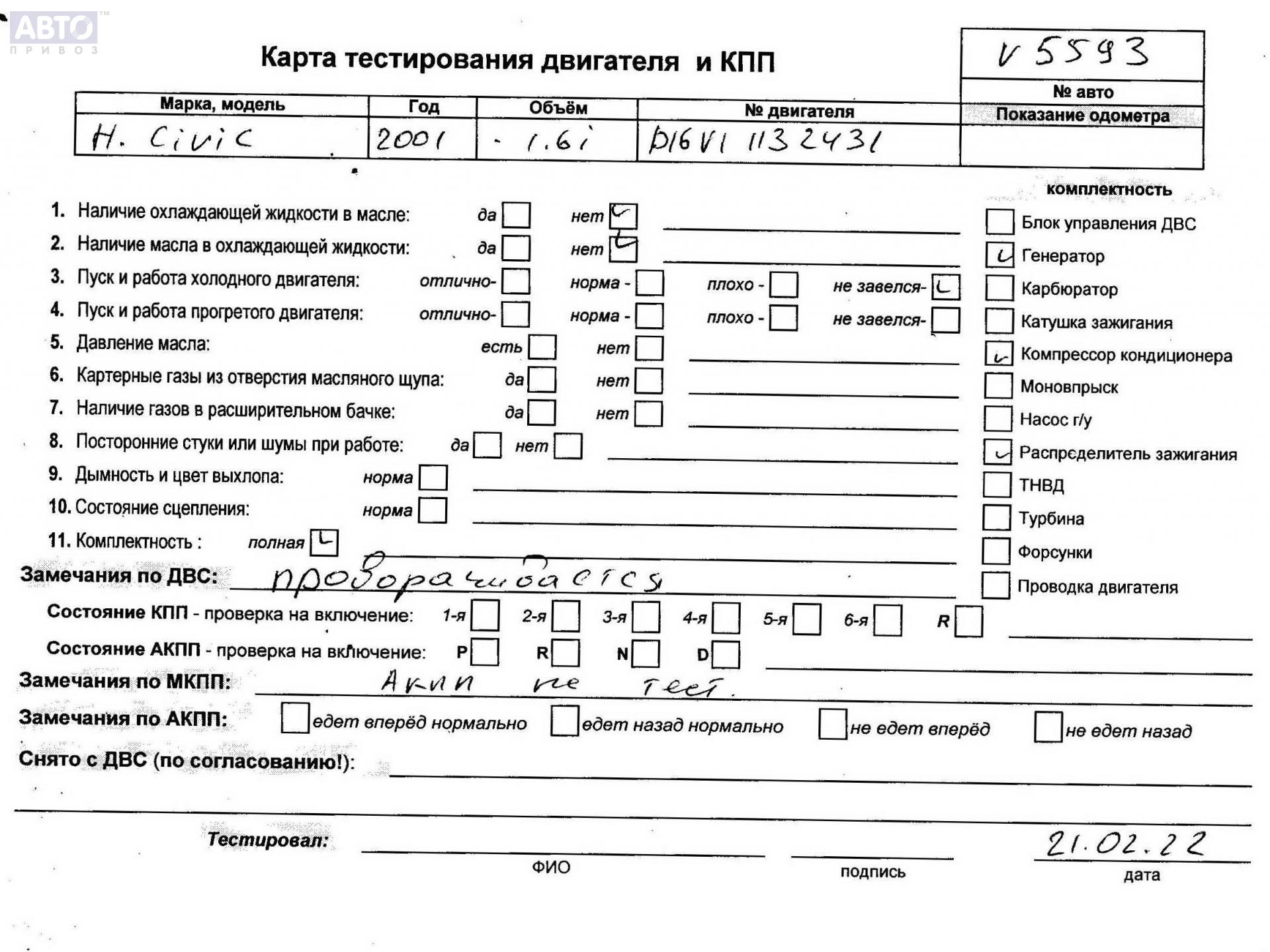 | Марка / Модель / Год: | Honda Civic (2001-2005) 2001 |