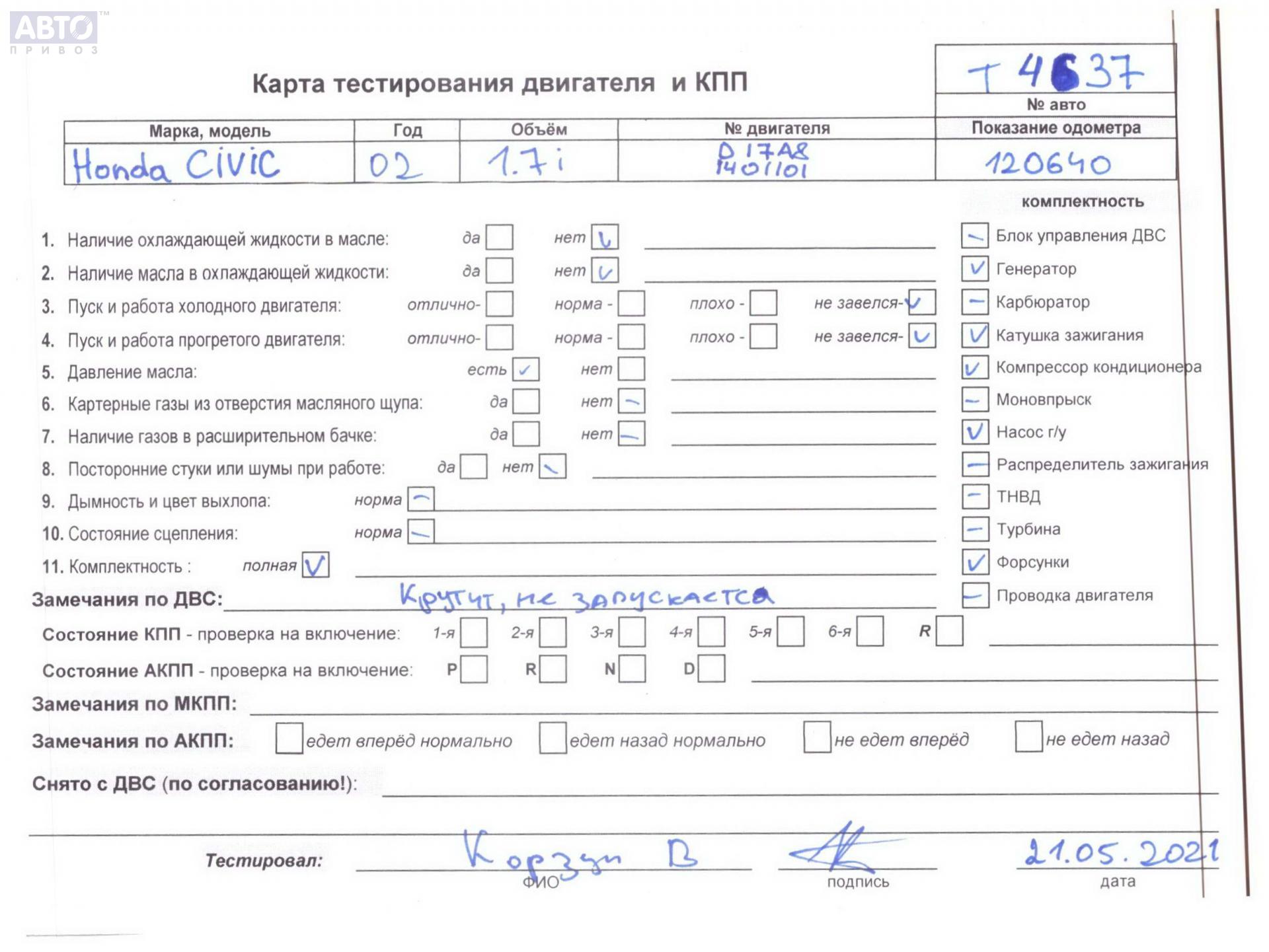 | Автомобиль / VIN: | T4637 1HGEM21501L603142 |