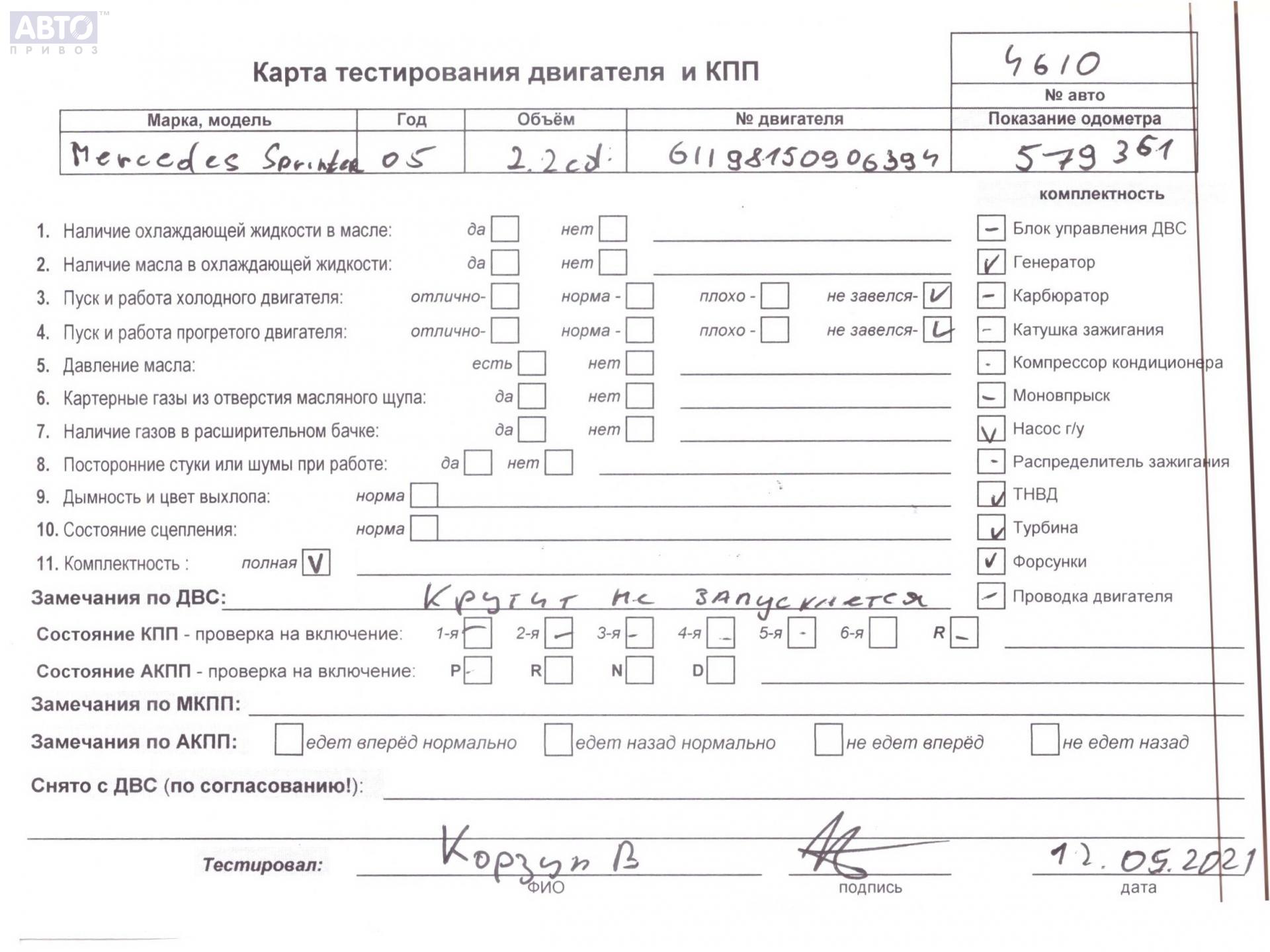 | Марка / Модель / Год: | Mercedes Sprinter W901-W905 (1995-2006) 2005 |
