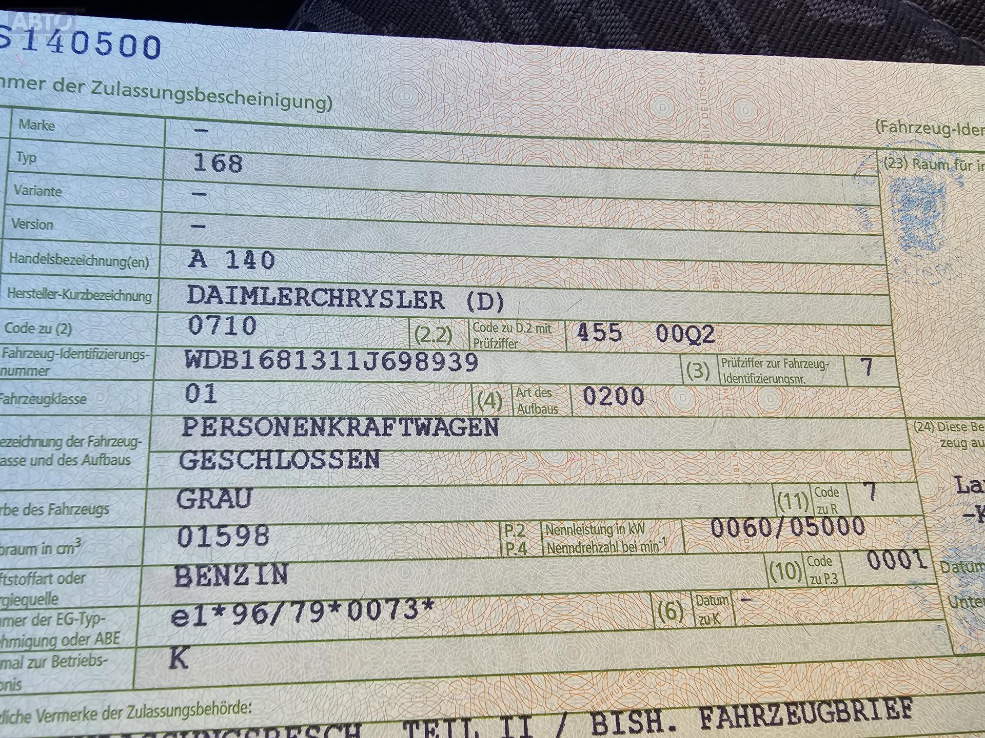 | Марка / Модель / Год: | Mercedes A-Class W168 (1997-2004) 2001 |