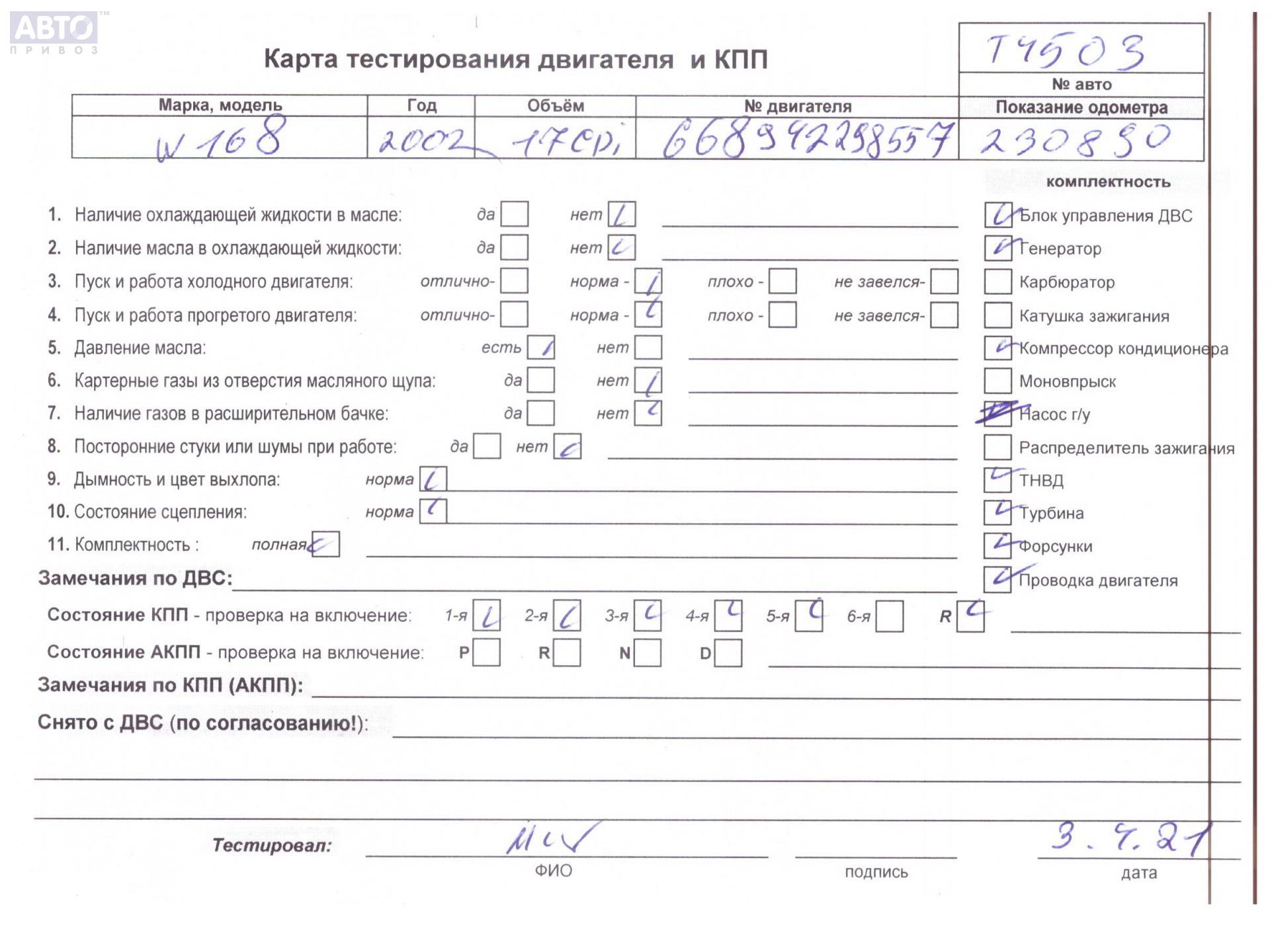 | Марка / Модель / Год: | Mercedes A-Class W168 (1997-2004) 2002 |