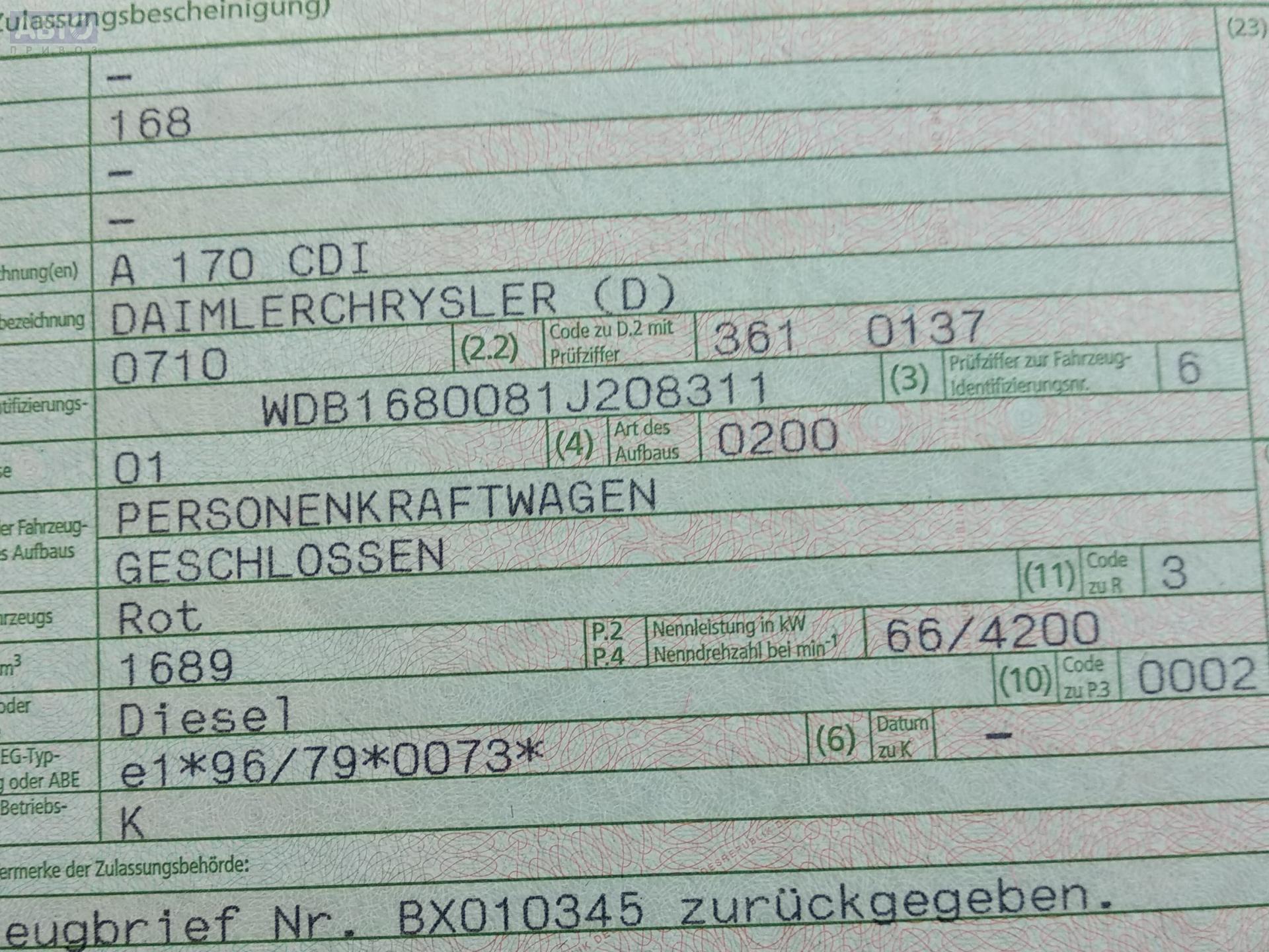 | Марка / Модель / Год: | Mercedes A-Class W168 (1997-2004) 1999 |