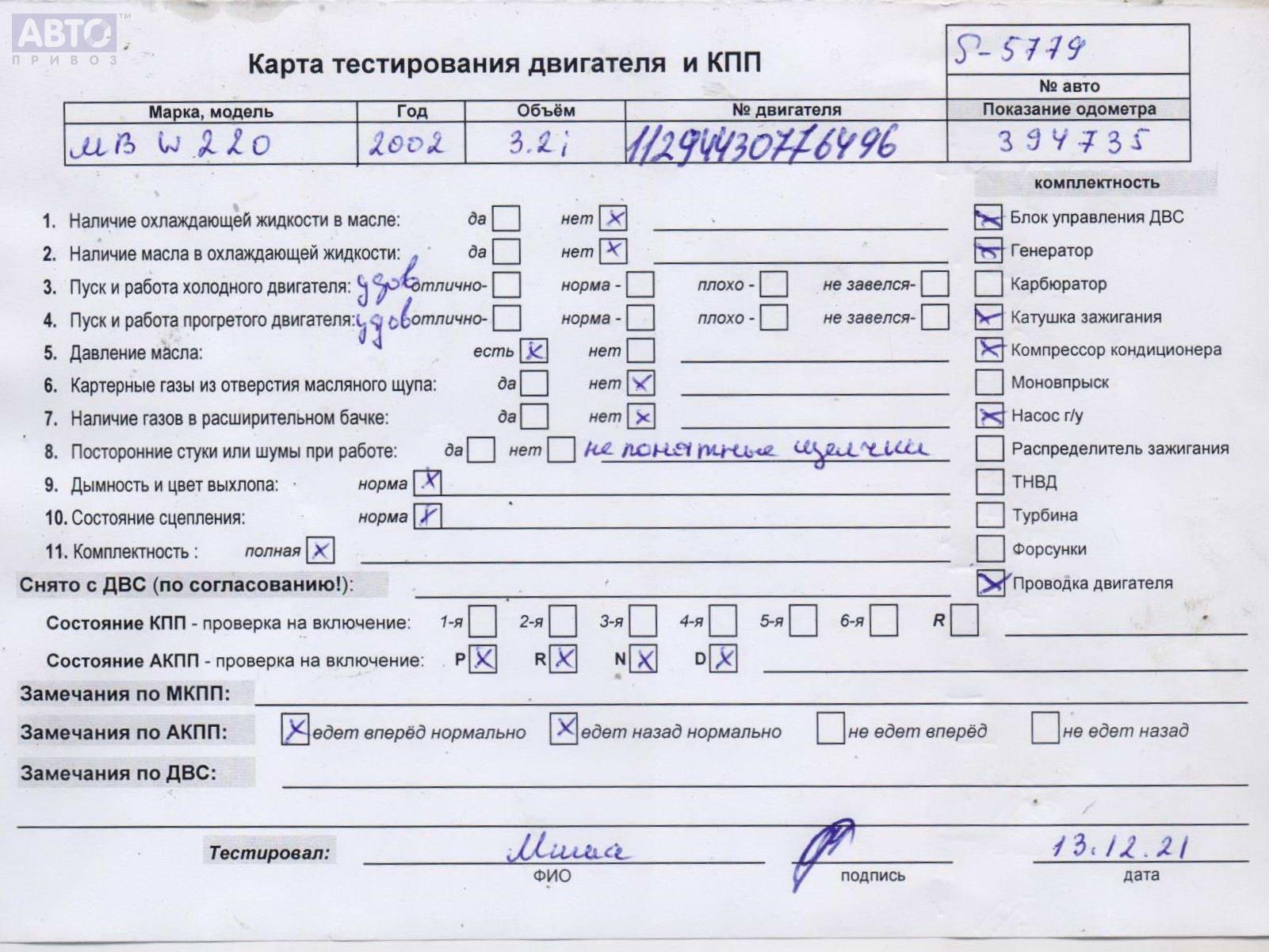 | Марка / Модель / Год: | Mercedes S-Class W220 (1998-2005) 2002 |