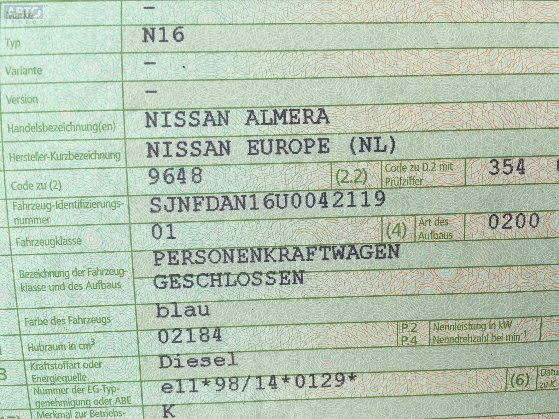 | Марка / Модель / Год: | Nissan Almera N16 (2000-2007) 2001 |