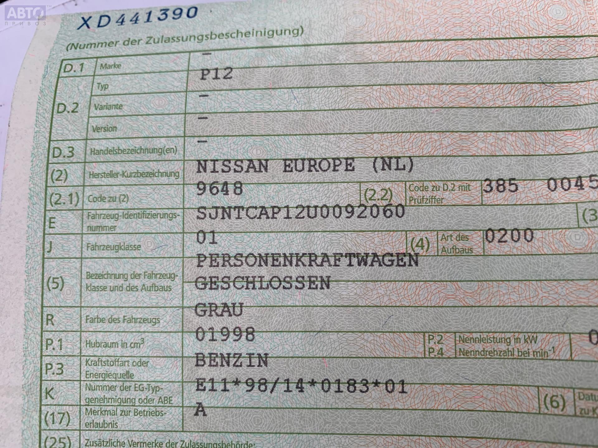 | Марка / Модель / Год: | Nissan Primera P12 (2002-2008) 2002 |