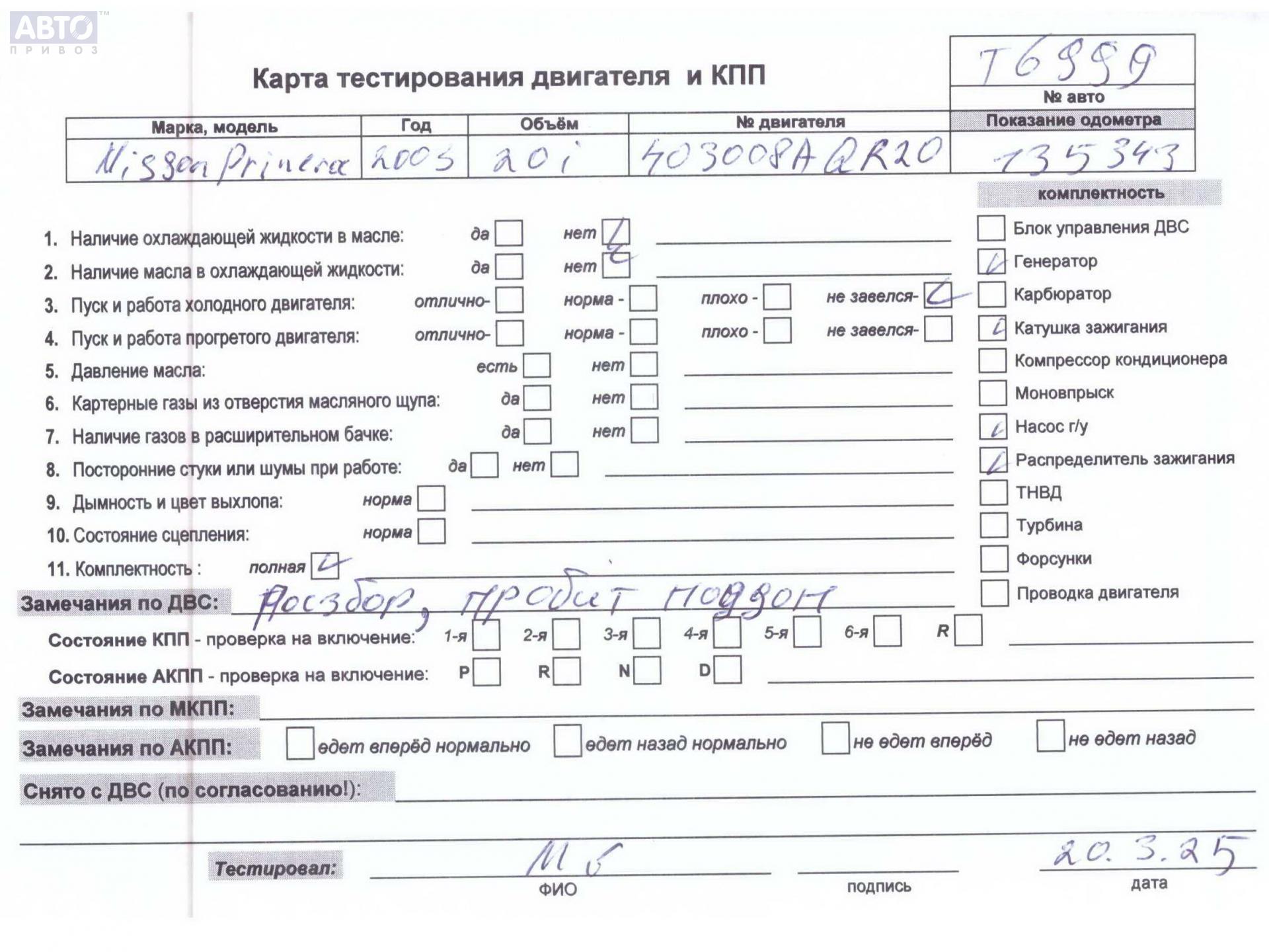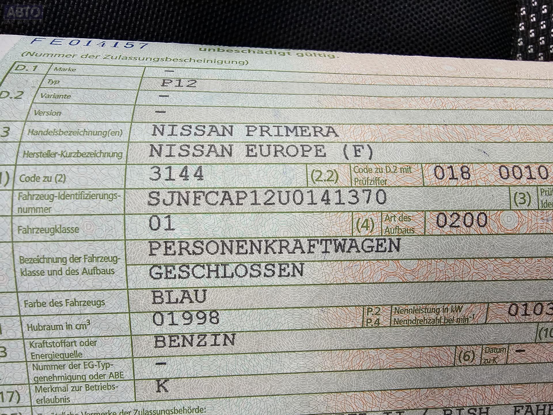 | Марка / Модель / Год: | Nissan Primera P12 (2002-2008) 2003 |