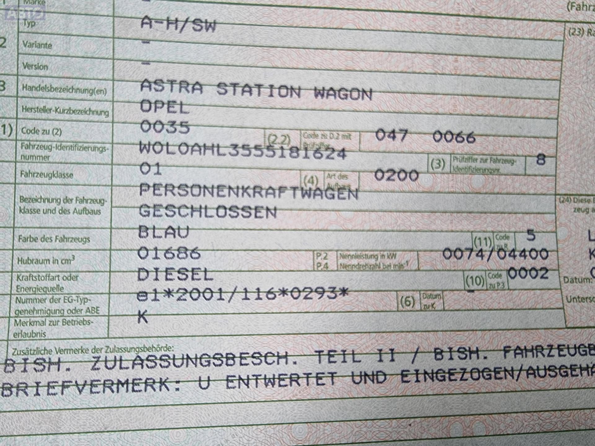 | Автомобиль / VIN: | T5434 W0L0AHL3555181624 |