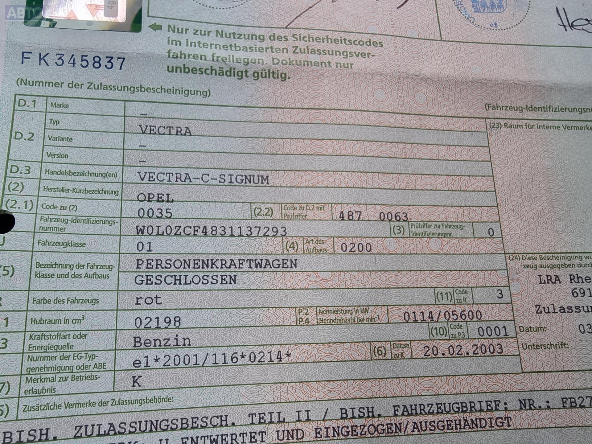 | Марка / Модель / Год: | Opel Signum (2003-2008) 2003 |