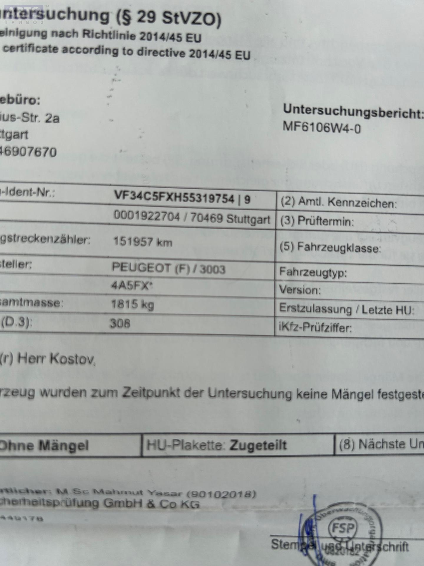 | Автомобиль / VIN: | S8091 VF34C5FXH55319754 |