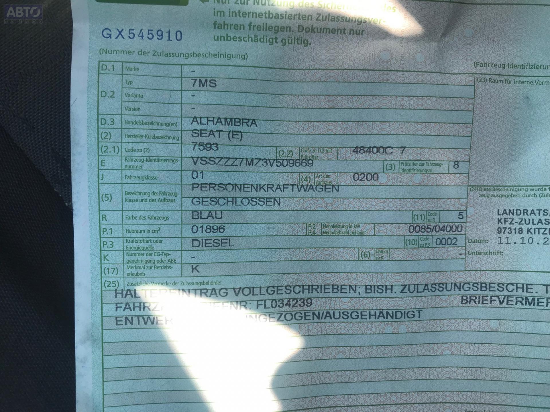 | Марка / Модель / Год: | Seat Alhambra (2000-2010) 2002 |