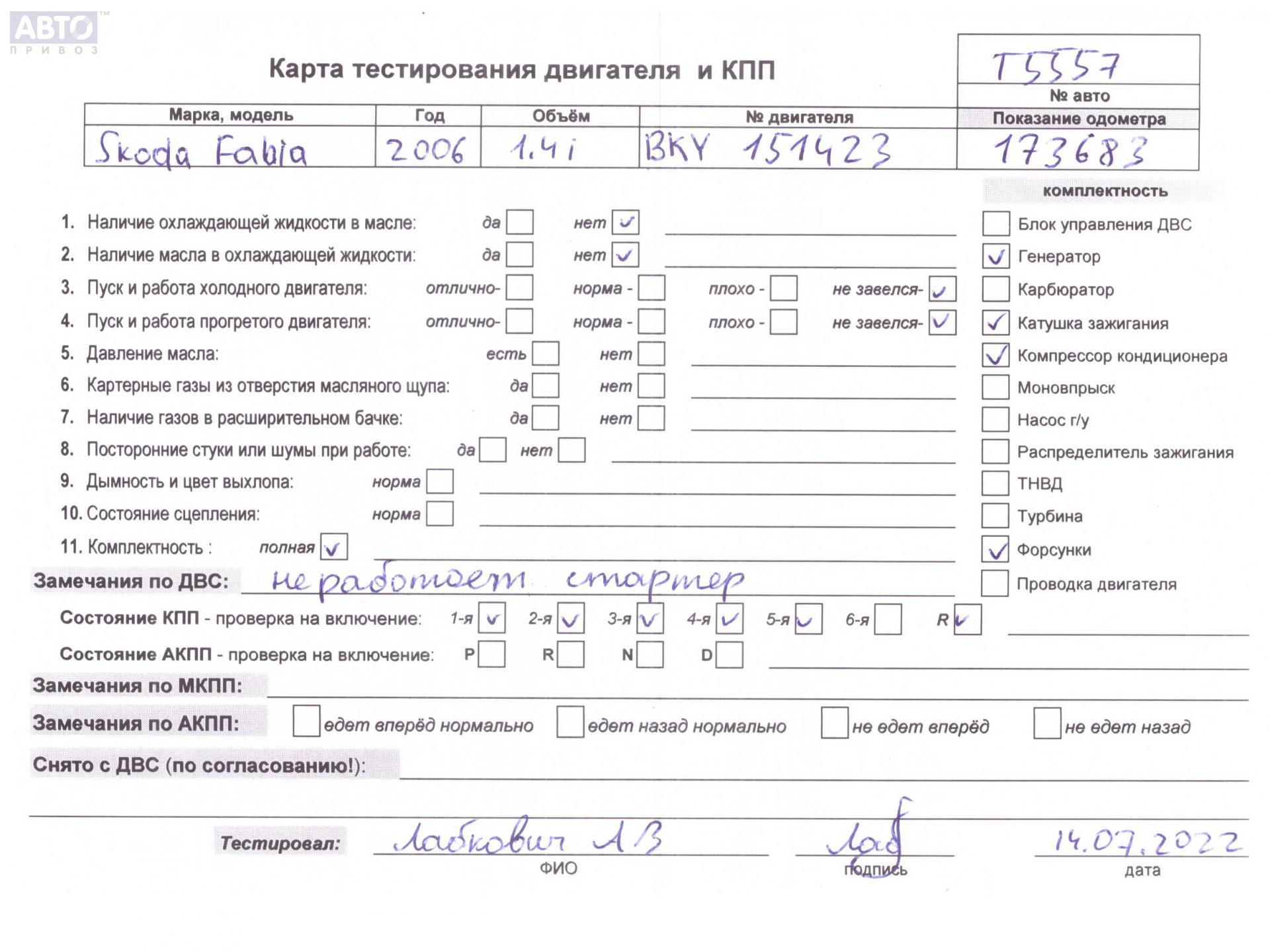 | Марка / Модель / Год: | Skoda Fabia mk1 (6Y) 2006 |