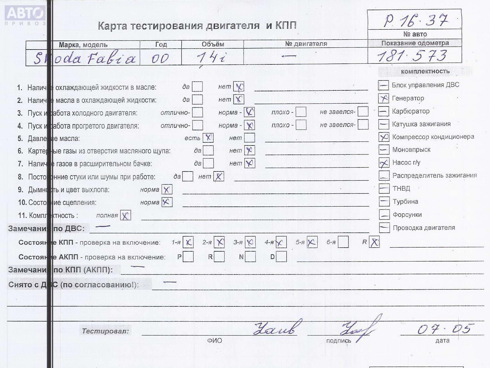 | Марка / Модель / Год: | Skoda Fabia mk1 (6Y) 2000 |