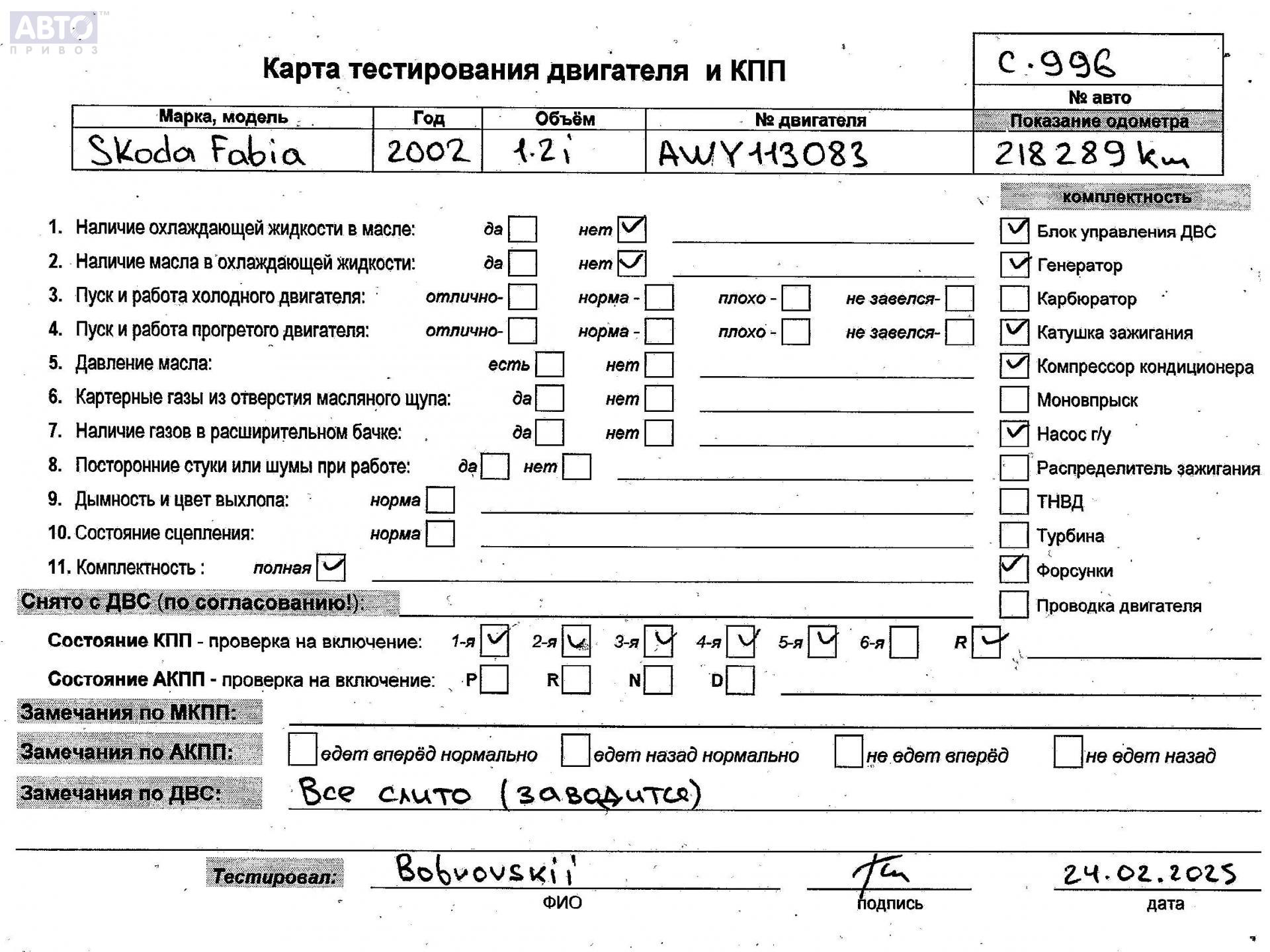 | Марка / Модель / Год: | Skoda Fabia mk1 (6Y) 2002 |