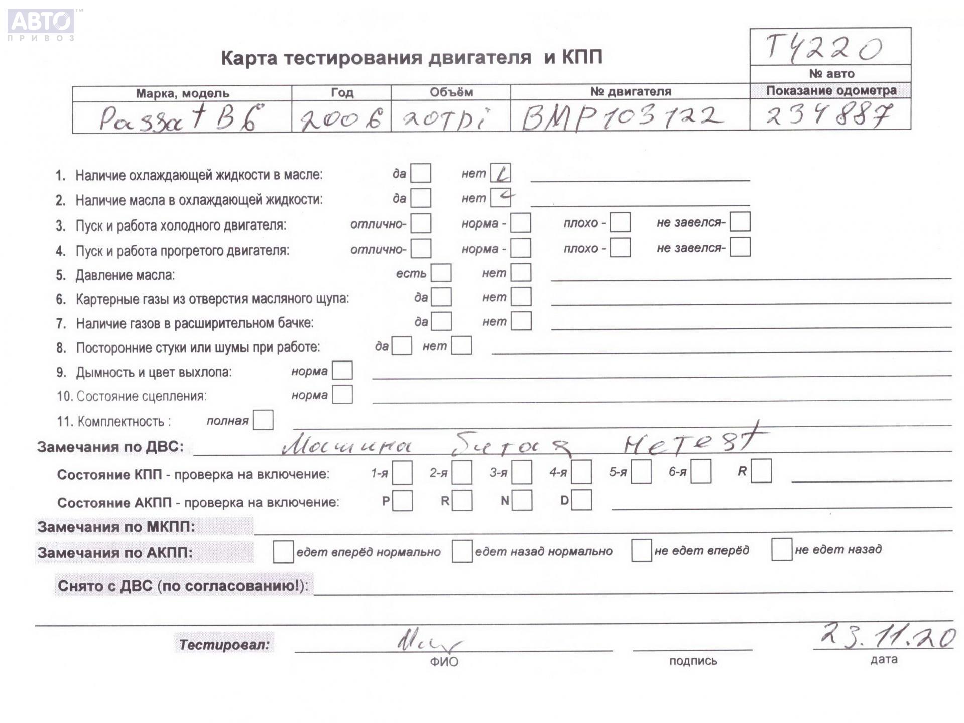 | Марка / Модель / Год: | Volkswagen Passat B6 2006 |