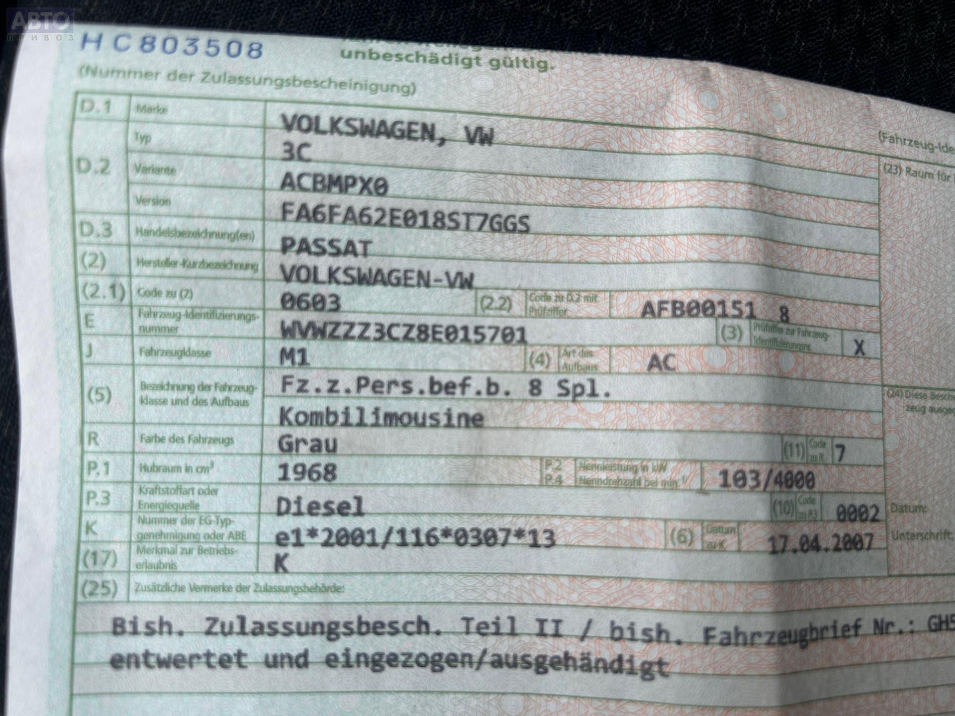| Марка / Модель / Год: | Volkswagen Passat B6 2007 |