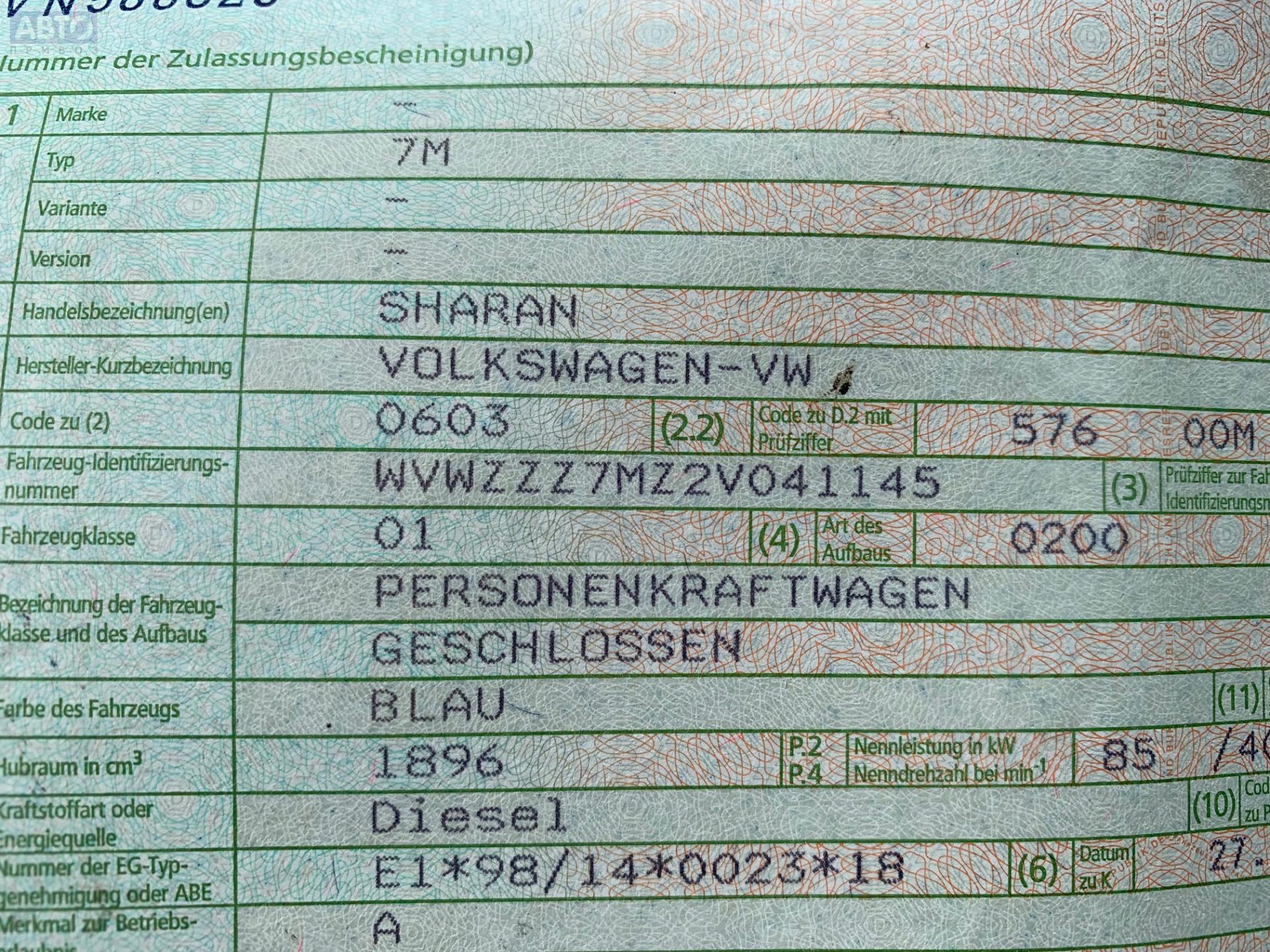 | Марка / Модель / Год: | Volkswagen Sharan (2000-2010) 2001 |
