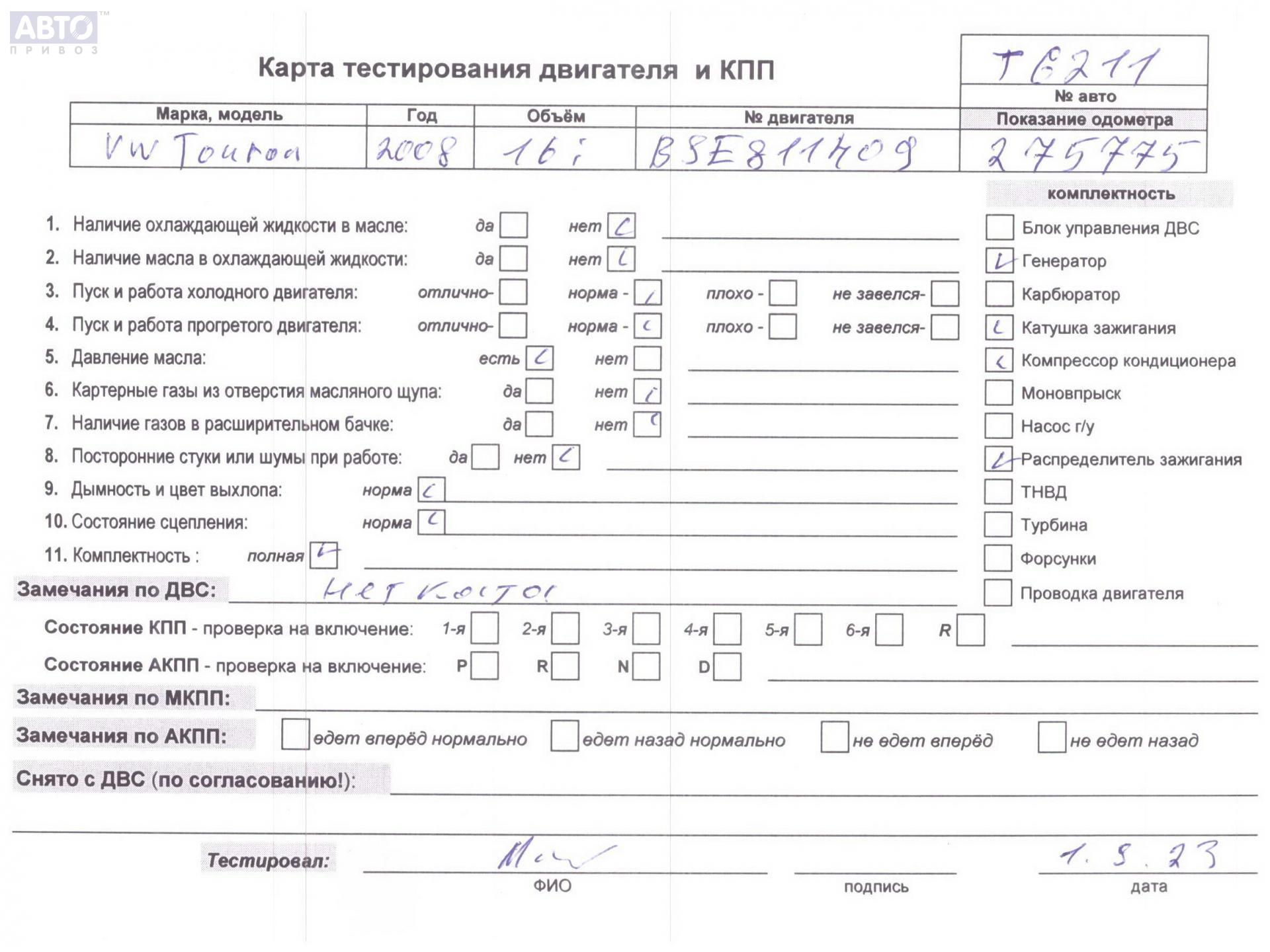 | Марка / Модель / Год: | Volkswagen Touran 2008 |