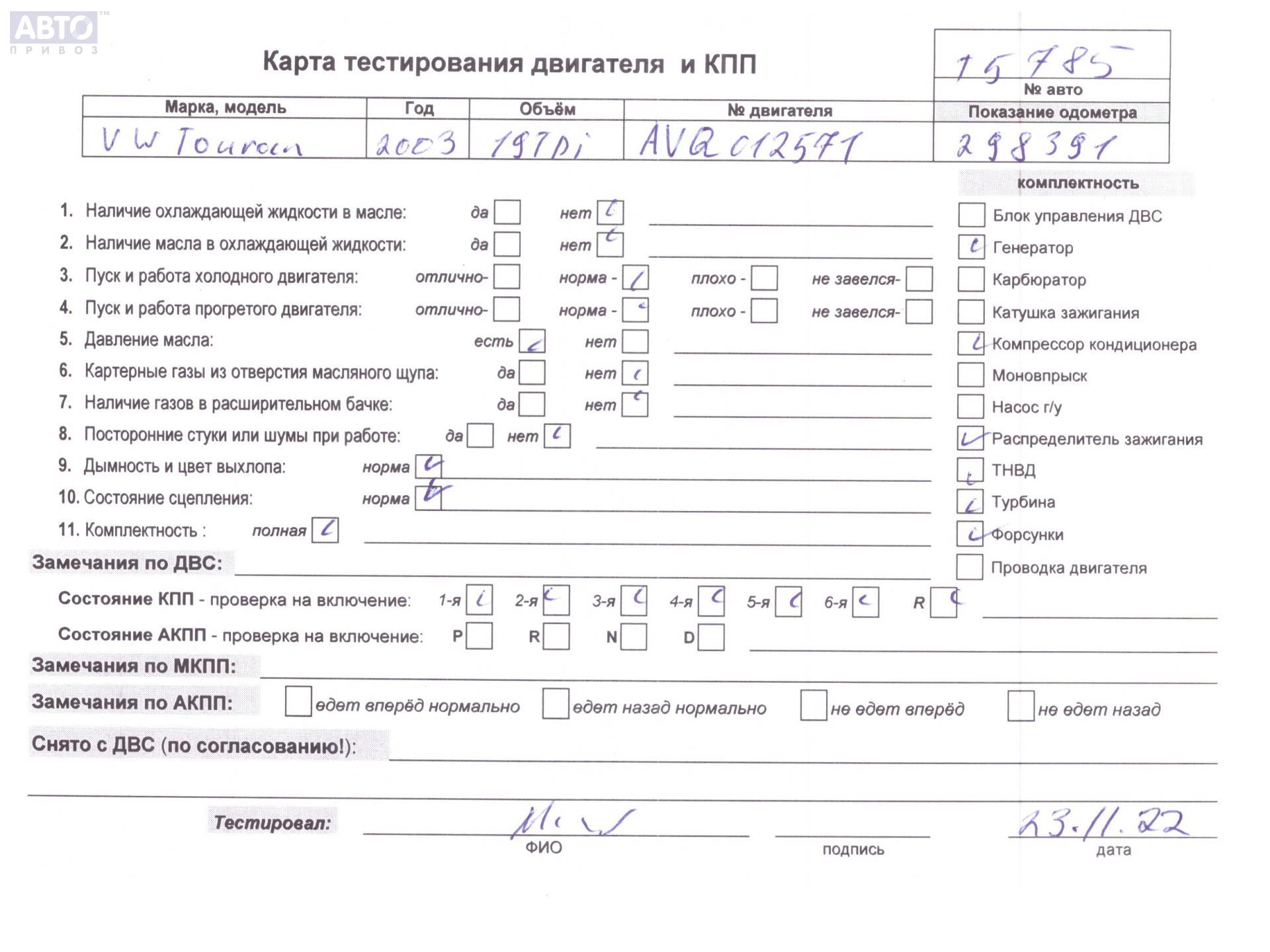 | Марка / Модель / Год: | Volkswagen Touran 2003 |